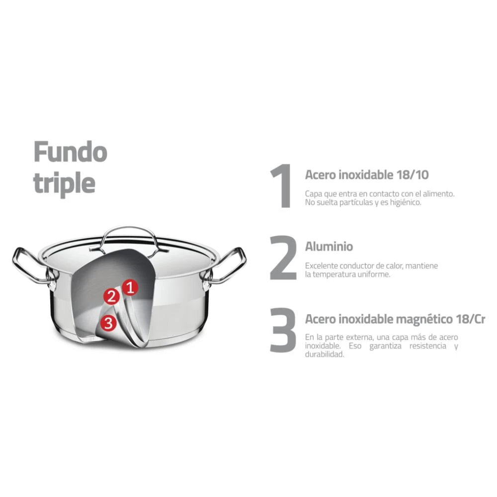Olla Alta Tramontina Professional de acero inoxidable fondo triple con tapa plana detalle satinado 20 cm 4,6 LrrCon la olla alta Tramontina de acero inoxidable fondo triple con tapa plana detalle satinado 20 cm de diámetro 4,6 L podrá preparar caldos, sopas y otros platos extraordinarios, garantizando todo el sabor y la cocción de los ingredientes. La línea Professional de Tramontina une diseño y funcionalidad. Producida de acero inoxidable, ofrece brillo y un detalle satinado, trayendo modernidad y elegancia para la cocina. Su fondo triple (acero inoxidable + aluminio + acero inoxidable) promueve una cocción rápida y uniforme de los alimentos, pues garantiza que toda la olla se caliente por igual. Transforme su rutina y la gastronomía con productos que hacen la diferencia.rrLa capacidad volumétrica máxima para cocinar es de 3u002F4 de la capacidad total de la pieza. rAntes de su uso, retire cualquier etiqueta presente en el producto; recomendamos lavarlo inmediatamente. rUse una fuente de calor suave, para evitar que el alimento se pegue al fondo de la olla alta. rEl fondo triple distribuye el calor uniformemente, sin necesidad de usar fuego alto. Además, eso genera ahorro de energía. rCuando se utilice la olla alta en cocinas a gas, la llama no debe exceder la base de la olla. Si se usa una chapa eléctrica, la chapa debe tener el mismo diámetro que la olla alta o diámetro menor. rNo caliente el alimento poniendo una olla alta u cualquier utensilio del mismo diámetro sobre o otro. Ese procedimiento es peligroso, porque crea vacío e imposibilita su retirada. rNo deje la olla alta vacía sobre una fuente de calor. rSiempre disuelva la sal en agua hirviendo o con los alimentos, mezclando los ingredientes al inicio de la cocción. rAlgunos alimentos que tienen almidón, como las pastas y el arroz, pueden dejar manchas en la parte interna de la olla alta durante la cocción. Para retirar fácilmente las manchas, pase un paño humedecido en jugo de limón o vinagre, o use la pasta de pulir acero inoxidable Tramontina. rEvite dejar alimentos en la olla alta durante mucho tiempo; la sal también puede provocar manchas. rPara que la olla alta de acero inoxidable esté siempre linda y brillante, le recomendamos lavarla solamente con detergente y esponja. Además, en las partes opacas de la olla alta se puede utilizar el lado más abrasivo de la esponja con saponáceo líquido para remover las manchas más difíciles. rDespués del lavado, siempre que sea posible, enjuague la olla alta con agua caliente y séquela inmediatamente, para que mantenga el brillo original, porque el cloro y las sustancias contenidas en el agua pueden dejar manchas en la olla. rVerificar las ollas y tapas cuyo sistema de fijación utiliza tornillos. Con el tiempo de uso, los tornillos pueden aflojarse. Por seguridad, se recomienda ajustarlos periódicamente. rSe puede llevar al horno a una temperatura máxima de 260°C, pudiendo ocurrir cambios de coloración. rLas asas,pomos y mangos se calientan durante la cocción. Aconsejamos el uso de guantes o paño durante su manipulación. rHay que tener cuidado al manejar el producto, principalmente con alimentos y líquidos calientes. rPara su seguridad, use el producto solamente hasta su capacidad máxima indicada.rrINFORMACIONES GENERALESrComida más sana: por ser de acero inoxidable, la olla alta Tramontina no libera ningún tipo de residuo en sus recetas. rFácil de usar: una olla alta práctica para todas sus recetas y que se luce en cualquier tipo de cocina: a gas, eléctrica, vitrocerámica y de inducción. Además, tiene tapa con salida de vapor y encaje perfecto. rMás durable: el acero inoxidable Tramontina es una materia prima noble, resistente y que se luce por mucho más tiempo en la cocina. Asas fijados por soldadura de punto, con mayor refuerzo. Asas largas de acero inoxidable para manejo profesional. rAhorrar tiempo y energía: el secreto está en el fondo triple (acero inoxidable + aluminio + acero inoxidable), que distribuye el calor uniformemente, proporcionando una cocción más rápida. Por eso, puede mantenerse el fuego bajo durante toda la preparación y así ahorrar energía. Además, olla alta totalmente fabricada en acero inoxidable puede ir al horno para gratinar o finalizar platos, a una temperatura máxima de 260º C. rFácil de limpiar: dejar su olla alta brillante es simple, sólo se necesita agua, jabón y una esponja blanda. Si prefiere, puede lavarla en el lavavajillas.