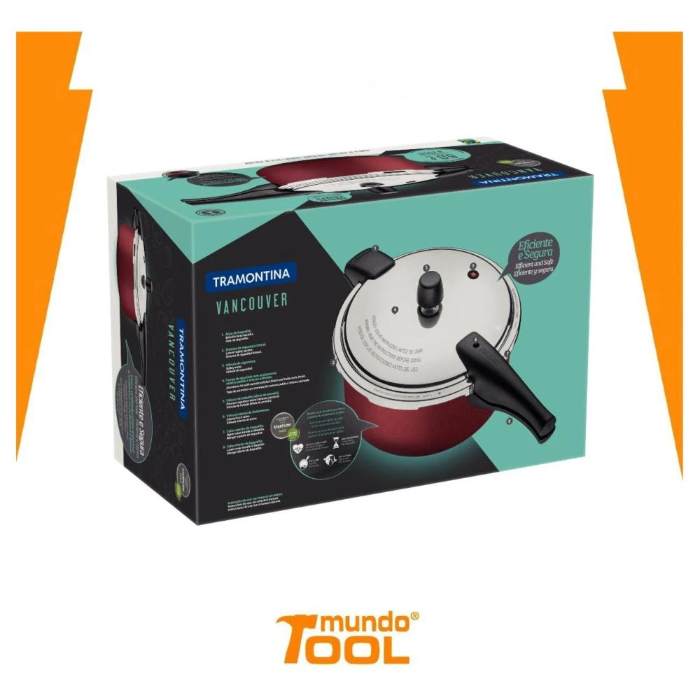Ya sea para aquella receta especial o rutinaria, la Olla a Presión Tramontina Vancouver de Aluminio con Revestimiento Interno y Externo Antiadherente Starflon Max Rojo 24 cm de diámetro y 6 l es la pieza ideal para acompañarte. Fabricada con cuerpo de aluminio rojo, va a proporcionar la cocción de los alimentos de forma uniforme y todavía evitar que se peguen, debido al revestimiento antiadherente Starflon Max aplicado en su interior y exterior. Para tu protección, la olla viene con tres válvulas de seguridad para que puedas cocinar de forma tranquila y sin preocupaciones. Sus pomos son de baquelita antitérmica, reducen la propagación del calor y garantizan mayor seguridad y comodidad durante el uso. Con Tramontina, tienes todo para dejar tu cocina más completa y tu rutina más práctica.rPesot2,10 kgrCapacidadt6.00 L