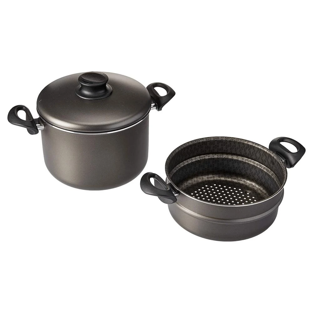 Olla Cozi-Vaporera Tramontina Paris Negro 5,7 L. La olla cozi-vaporera Paris de Tramontina tienen un revestimiento interno y externo antiadherente Starflon Max, para una cocción uniforme en todo momento y un cocinado más sano, evitando, además, que se pegue la comida. La olla vaporera cuenta con asas antitérmicas, y también con una tapa de vidrio templado con pomo de nylon y salida de vapor. En color negro. Olla Cozi-Vaporera Tramontina Paris Negro 5,7 LGran capacidadLa olla cozi-vaporera cuenta con un tamaño de: 22 cm de diámetro y una capacidad total de 5,6 litros. Unas medidas óptimas para utilizar en tu cocina en cualquier momento. En color negro.AntitérmicoLas asas de esta olla cozi-vaporera de Tramontina son de baquelita antitérmica y el pomo de la tapa es de nylon, lo que ofrece seguridad durante el manejo, evitando además quemaduras por aumento de temperatura.Acero inoxidableLa olla cozi-vaporera París de Tramontina está elaborada con aluminio antiadherente Starflon T1, que garantiza una cocción uniforme y una limpieza sencilla para facilitarte la tarea cuando cocines.La olla cozi-vaporera está elaborada con aluminio con revestimiento interno y externo de antiadherente Starflon T1, que no deja que se peguen los alimentos y es fácil de limpiar, más durable y no perjudicial para la saludLas asas son de baquelita antitérmica y el pomo es de nylon, lo que ofrece seguridad durante el manejo, evitando además quemaduras por aumento de temperaturaLa olla cozi-vaporera tiene un tamaño de 22 cm de diámetro y una capacidad total de 5,6 litros, convirtiéndola en una pieza fundamental para tu cocinaLa olla cozi-vaporera de Tramontina viene con una tapa de vidrio templado con salida de vapor y borde de acero inoxidable, que ayuda y permite acompañar la preparación de cualquier receta recetaLa olla cozi-vaporera Paris se puede utilizar en cocinas a gas, eléctricas o vitrocerámicas (resistencia eléctrica), además de poder lavarse en el lavavajillas
