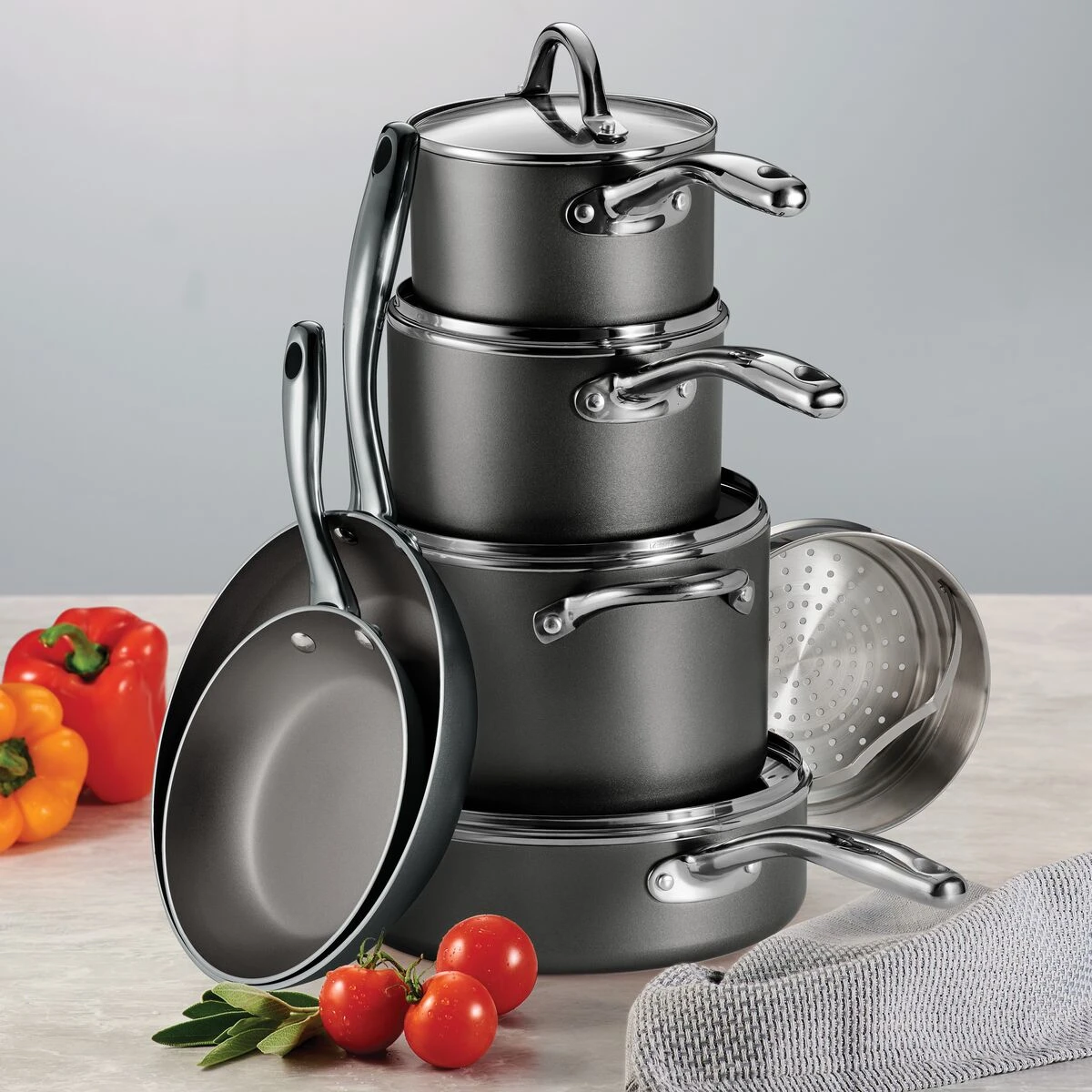 Tramontina”s 11-Piece Nonstick Cookware Set offers versatile pots and pans for cooking meals of every size. Featuring an attractive metallic colored exterior, this durable set is constructed of heavy-gauge aluminum for quick, even heat distribution when you want to brown, sear, braise and pan-fry. The titanium reinforced nonstick interiors are made without lead or cadmium and give quick release to food so you can cook with less oil. Plus, it makes cleanup a snap as the cookware can be tossed in the dishwasher. Tempered glass lids allow you to monitor your cooking progress, and ergonomically designed cast stainless-steel handles are riveted for extra support when handling cookware. This nonstick cookware is compatible with gas, electric and ceramic glass cooktops and can be used in the oven up to 350° F.
