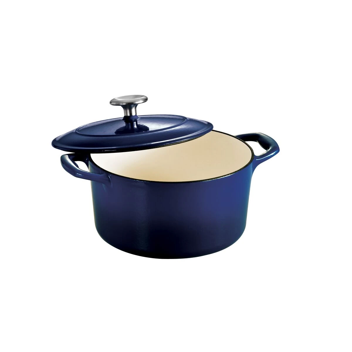 Tramontina”s 3.5 Qt Enameled Cast Iron Round Dutch Oven is ideal for one-pot meals, braising pot roast, slow-cooked stews, and so much more. Prized by cooks for heat retention and even cooking, this beautifully crafted 3.5 Qt Enameled Cast Iron Dutch Oven is an essential piece for any chef”s kitchen. It is available in a variety of striking colors and porcelain enamel exterior finishes – offering elegant kitchen to table serving. The self-basting condensation ridges on the lid uniformly collect and direct vapors onto food, providing outstanding cooking results for flavorful meats, soups, stews, breads, cobblers and many other savory dishes. The heavy-gauge cast-iron cooking surface is coated with an off-white, smooth, and easy-to-clean, PTFE and PFOA-free porcelain enamel. Its integral side handles provide added support when handling a filled pot, and the cast stainless steel knob is oven-safe – giving you flexibility to bake or roast at higher temperatures up to 450°F.