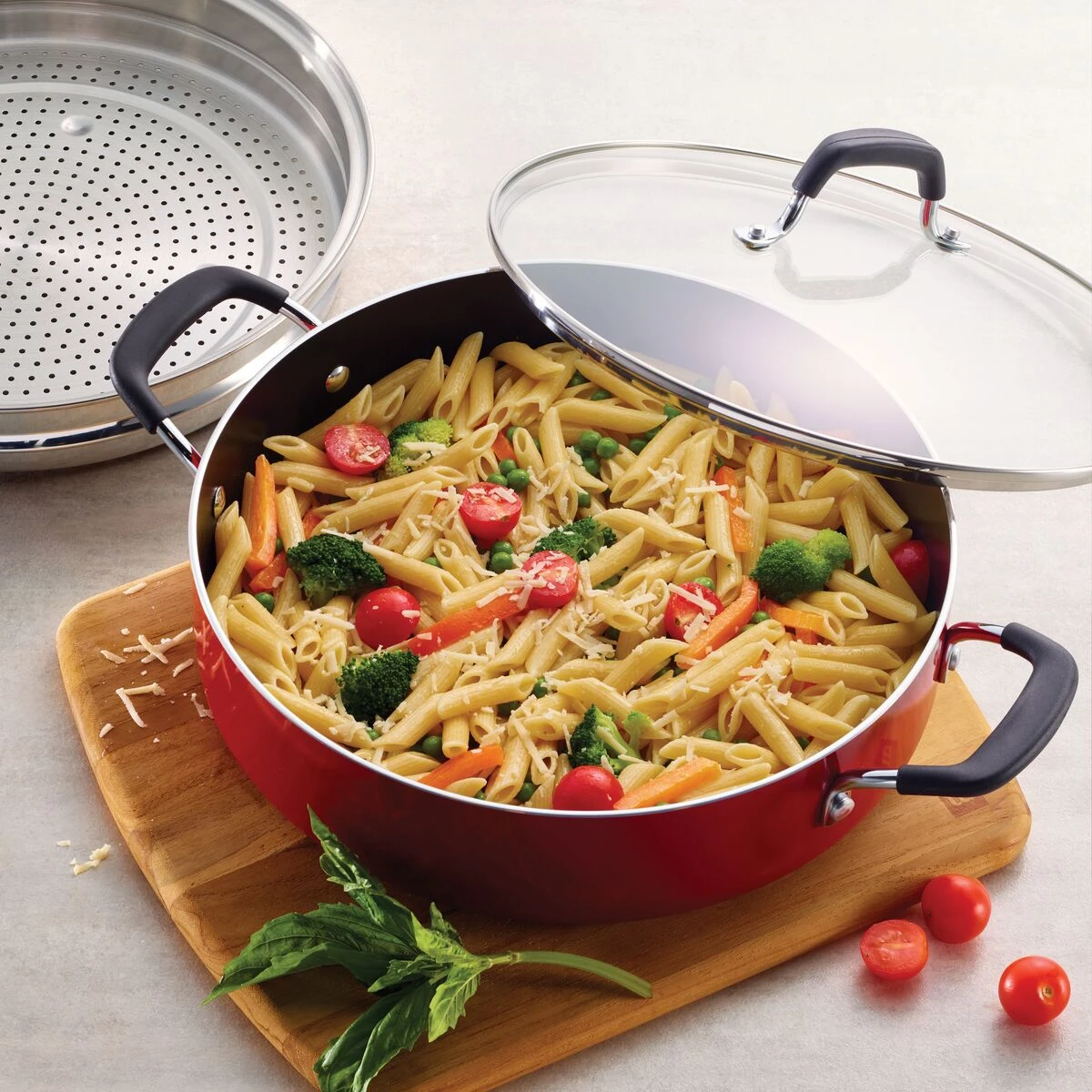Meet your new favorite pan for steaming, frying, sautéing, searing, browning, deglazing and braising family-sized dishes. The Tramontina Everyday 3 Pc Aluminum Pan Set is an all-in-one marvel for cooking everything from bacon to casseroles. With its deep sides and 5.5 Qt capacity, this pan was built for everyday use. Made of heavy-gauge aluminum, this heavy-duty pan distributes heat quickly, and boasts a Teflon® Platinum nonstick, reinforced triple coated interior, made without lead or cadmium, that lets food release easily from the pan. A porcelain enamel exterior adds a pop of color and elegance to match your kitchen. The pan?s heat- and shatter-resistant tempered glass lid lets you keep and eye on your cooking progress and locks in savory flavors. Ergonomically designed, soft-grip silicone over solid stainless steel handles are comfortable, and riveted to the pan for added support when handling. Its stainless-steel steamer allows you the option to cook veggies or seafood on their own, or to multi-task, and steam them while you sear up meat in the pan below. It also doubles as a splatter shield when cooking messier foods, like bacon and fried chicken. Available in a variety of colors.