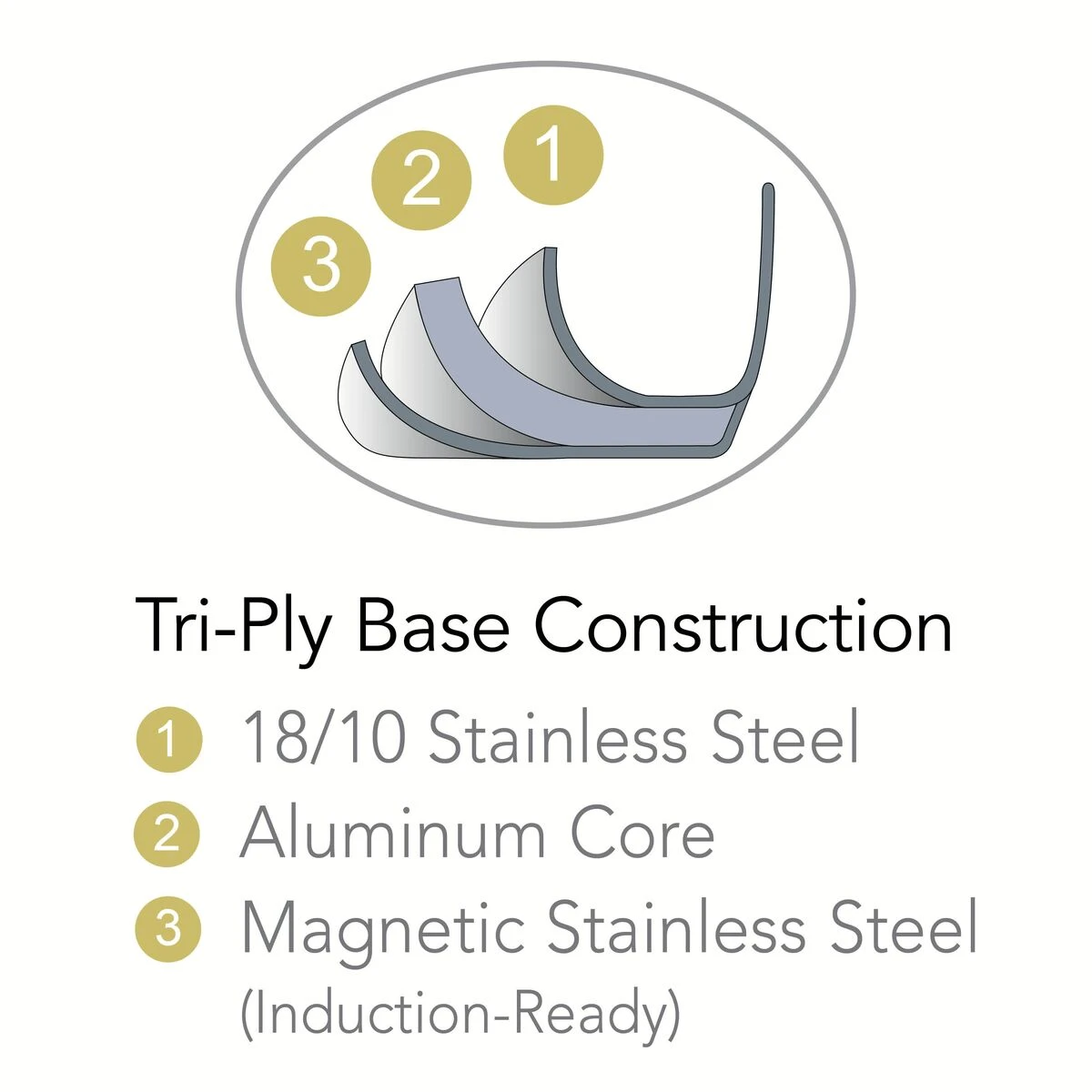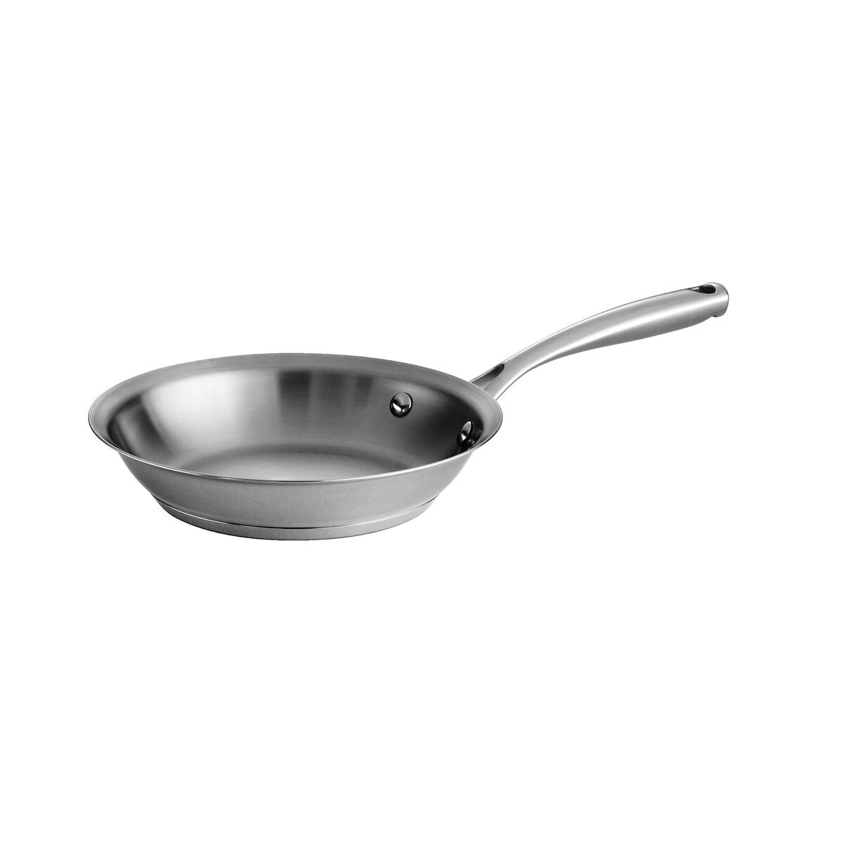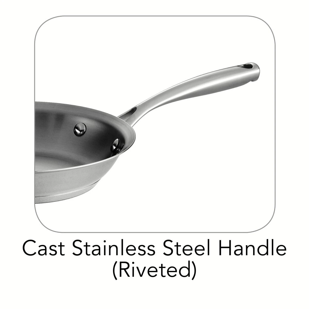 Sleek, reliable, and designed with busy cooks in mind, the Tramontina Prima 8 in Fry Pan combines superior durability and high performance for small meals for one. Its tri-ply base is impact-bonded with a pure aluminum core between a layer of 18/10 stainless steel and a layer of magnetic stainless steel that provides even heating, while its modern lines feature a flared edge for easy and no-drip pouring. Riveted, stainless steel handle add extra support for easy maneuverability, and a mirror-polished exterior finish adds a touch of elegance to your kitchen. Excellent for frying, sauteing, searing, browning, or braising food on any cooktop – or in the oven – this is one you can use every day, whether you”re a new cook or an experience pro.