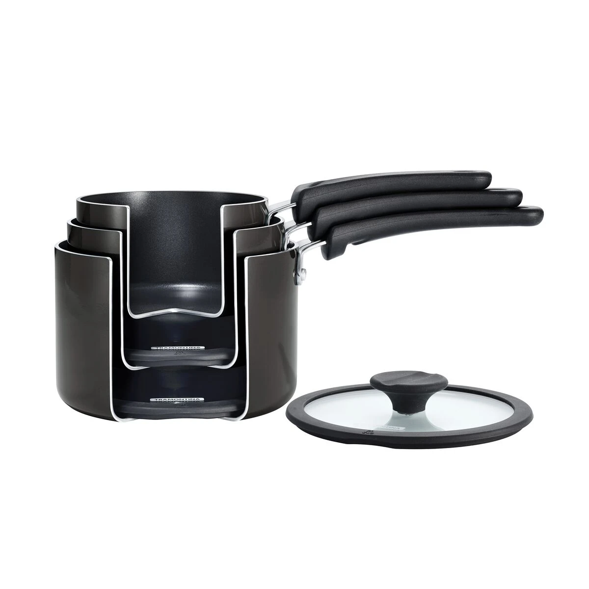 – Durable, easy-to-clean, high-quality cookware that saves up to 50% more storage space