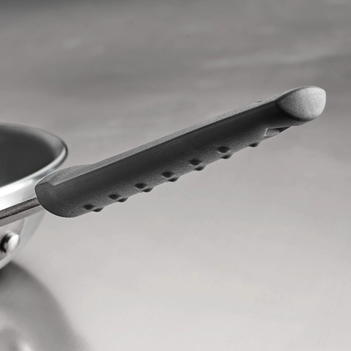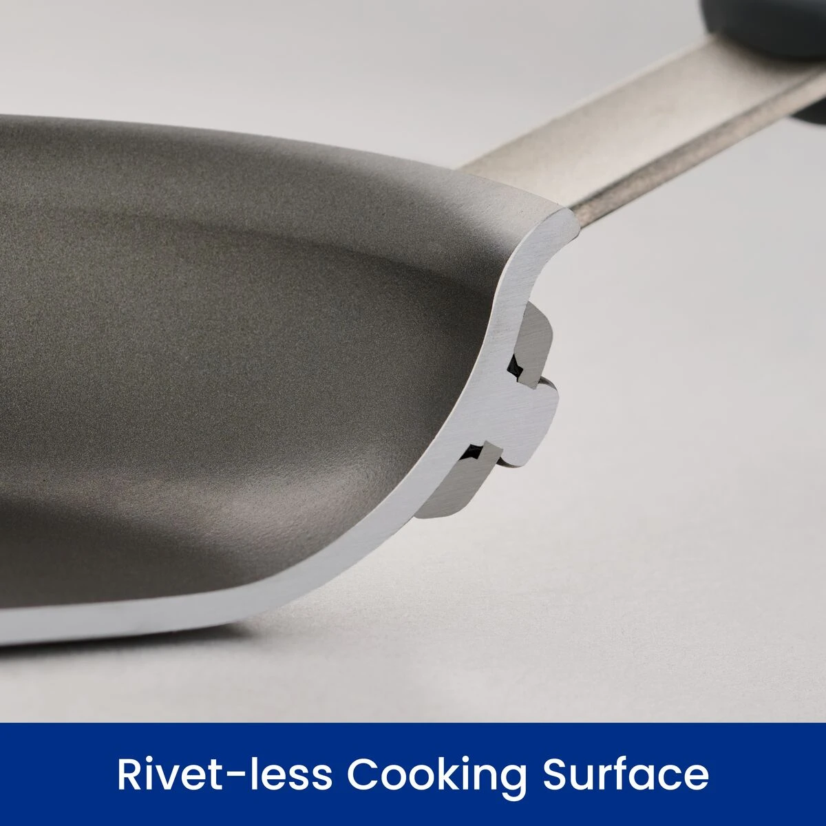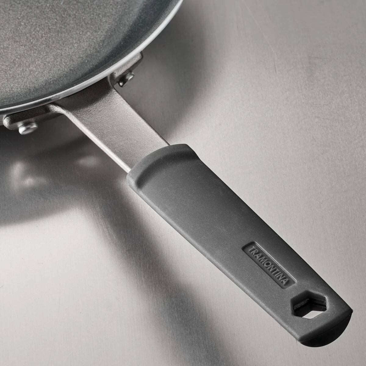 Fry, scramble, brown, saute, and sear for the family like an experienced chef! Tramontina`s PRO Fusion 14 in Fry Pan is larger than most pans, and features a new Fusion Rivet System which provides a rivet-less, smooth interior cooking surface. This clever and exclusive system provides easy cooking and effortless cleanup, while maintaining all the strength and durability of a traditional riveted handle assembly, and the cast stainless steel handle features a removable, silicone, soft-grip for maneuverability. The rivet-less cooking surface, combined with the advanced nonstick coating, provides high performance and excellent food release. The fry pan”s commercial-grade, heavy-gauge aluminum construction distributes heat quickly and evenly. These pans are designed and manufactured to withstand the rigors of a professional kitchen, and easily adapt to home and non-commercial use. This cookware is NSF certified, compatible with gas, electric and ceramic glass cooktops, can be used in the oven up to 400°F / 204°C.