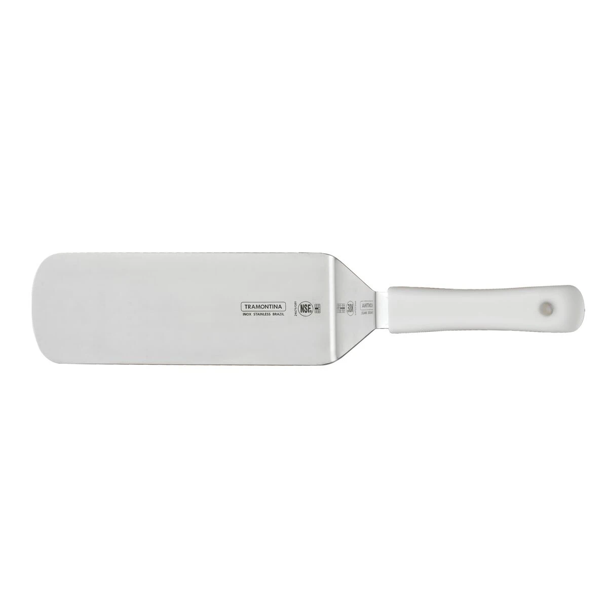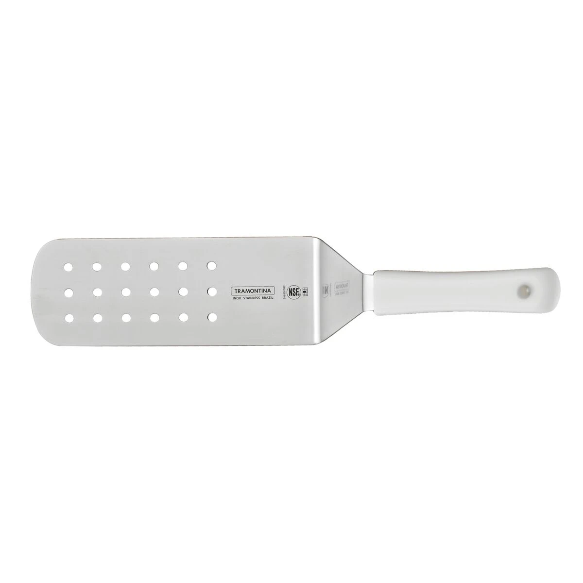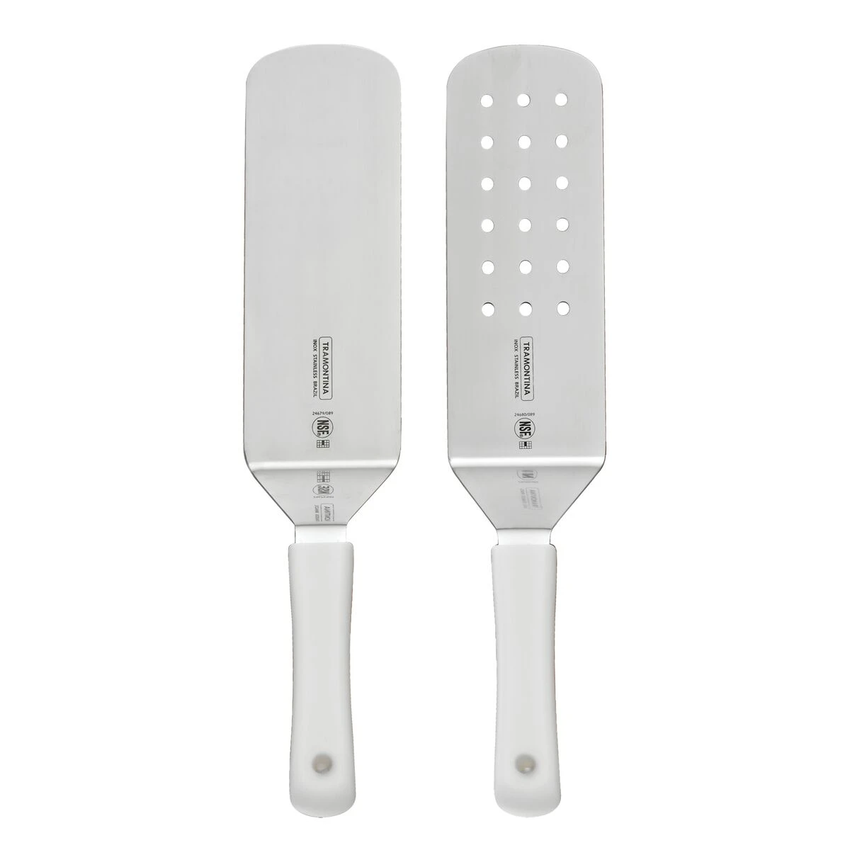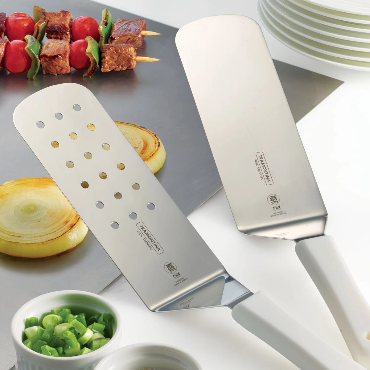 A must-have tool for any professional chef, this 2 pk turner series is extremely versatile. It can stand up to everyday use in a busy restaurant kitchen and is the perfect addition to the at-home cooking enthusiast”s arsenal. From flipping fluffy omelets to serving sumptuous steaks, these turners will be the workhorse behind large family meals, small intimate gatherings, and everything in between. The turners” heat-resistant stainless steel makes it the ideal tool whether used for cooking, baking, or grilling. Our solid turner is durable enough to support heavy foods to turn and lift food with ease but does double duty as a fantastic flapjack flipper. Our perforated turner gracefully slides under food, allowing fat and excess liquids to conveniently drain off. The white, non-slip handles made of durable polypropylene enhances the manageability of this set. This set also features anti-microbial protection to keep germs far away from your delicious meals. Makes a perfect gift for your favorite chef and is a great replacement for the worn-out plastic turners in your drawer that you have been holding on to since college. Clean-up is a breeze as these tools are dishwasher-safe. Made in Brazil and part of Tramontina”s Pro Line series, this set comes with a lifetime warranty.